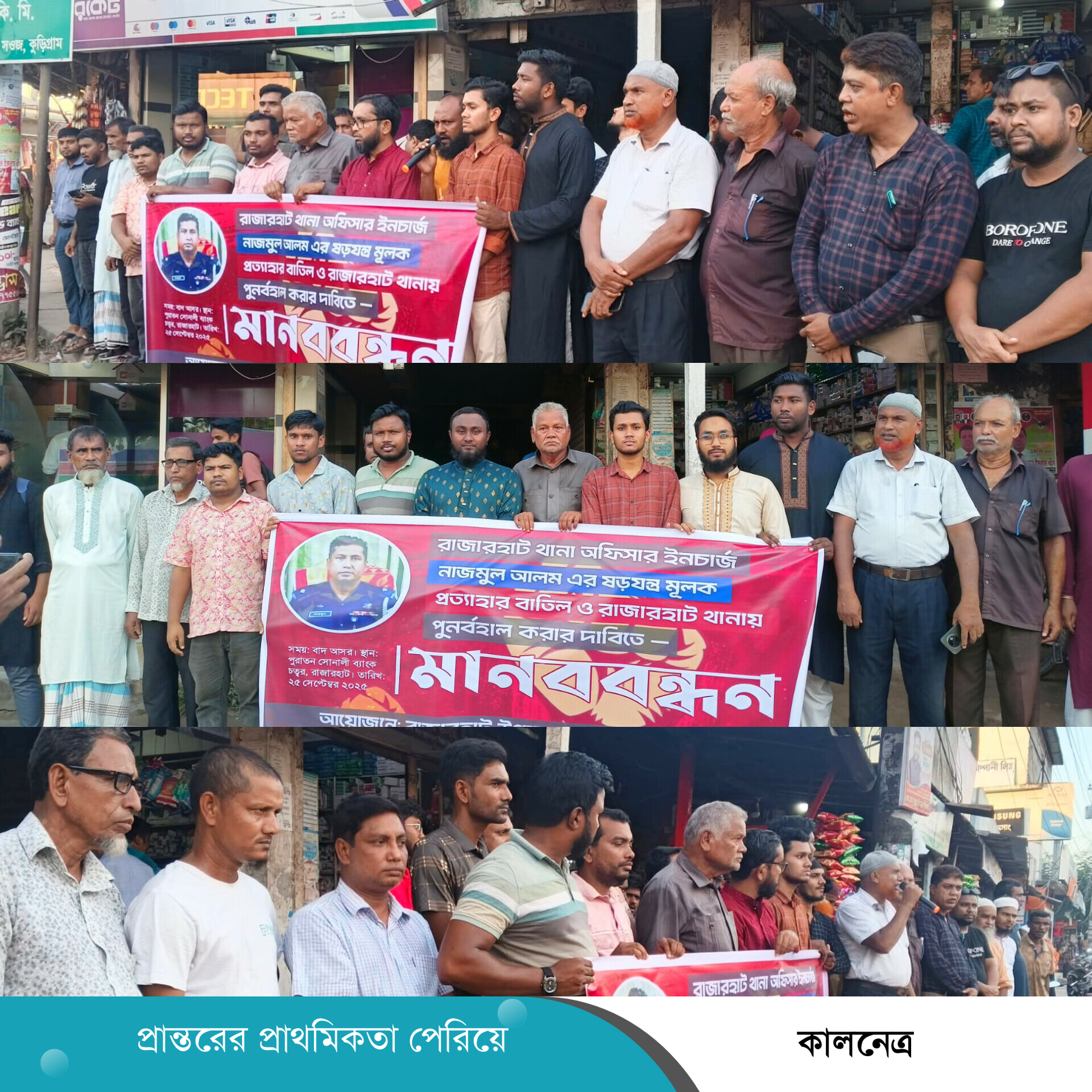 হাফিজুর রহমান, রাজারহাট প্রতিনিধি: কুড়িগ্রামের রাজারহাটে থানার অফিসার ইনচার্জ (ওসি) নাজমুল আলম লিংকনের ষড়যন্ত্রমূলক প্রত্যাহারের প্রতিবাদে মানববন্ধন কর্মসূচি পালন করেছে এলাকাবাসী। বৃহস্পতিবার ২৫ সেপ্টেম্বর বিকাল ৪.০০টা দিকে পুরাতন সোনালী ব্যাংক চত্বরের সামনে এ মানববন্ধন অনুষ্ঠিত হয়।