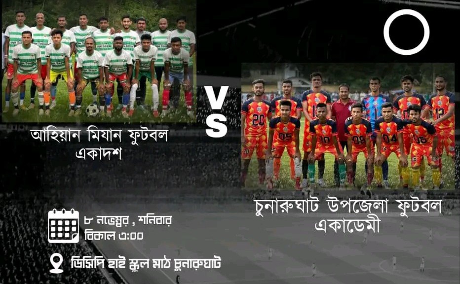 চুনারুঘাট উপজেলা ফুটবল একাডেমির অধীনে পরিচালিত পৌরসভার ঐতিহ্যবাহী ডিসিপি হাইস্কুল মাঠে শনিবার ৮ নভেম্বর তারিখে একটি প্রীতি ফুটবল খেলার ম্যাচ অনুষ্ঠিত হবে । চুনারুঘাট উপজেলা ফুটবল একাডেমি এবং আহিয়ান মিজান ফুটবল একাদশ, বিয়ানীবাজার, সিলেট এই দুটি দলের মধ্যে প্রীতি ম্যাচটি খেলা হবে।