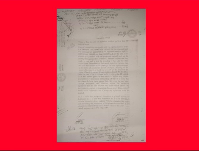 বাদী দাবি করেছেন যে তারা তাদের সুবিধার্থে ১ লক্ষ টাকা ব্যয় করে একটি রাস্তা এবং একটি গেট তৈরি করেছেন। আসামী নং ১-৪ আপত্তি তুলে দাবি করেছেন যে এই রাস্তাটি জনসাধারণের পথের জন্য ব্যবহৃত হয়েছিল এবং এইভাবে আর.এস. খতিয়ানে সরকারের নামে যথাযথভাবে লিপিবদ্ধ করা হয়েছে। মামলার সমস্ত রেকর্ড পর্যালোচনা করে দেখা গেছে যে বাদী নিবন্ধিত দলিলের মাধ্যমে এস.এ. রেকর্ডের মালিকের কাছ থেকে স্বত্ব পেয়েছেন। অন্যদিকে, আসামীদের দাবির ভিত্তি কেবল আরএস রেকর্ডের উপর। এটি একটি সুপ্রতিষ্ঠিত নীতি যে অধিকার রেকর্ড কেবল দখলের অনুমান তৈরি করে। এই সমস্ত বিবেচনা করে দেখা গেছে যে বাদীদের মামলার জমির উপর প্রাথমিকভাবে আরও ভাল মালিকানা রয়েছে। যদিও আসামীরা অস্থায়ী নিষেধাজ্ঞার বিরুদ্ধে আপত্তি উত্থাপন করেছেন কিন্তু কোনও উন্নয়ন কর্মসূচি চলছে বলে প্রমাণিত করে এমন কোনও কাগজপত্র উপস্থাপন করেননি। অতএব, আদালত মনে করেন যে অস্থায়ী নিষেধাজ্ঞার আদেশ না দেওয়া হলে বাদীর অপূরণীয় ক্ষতি হবে।