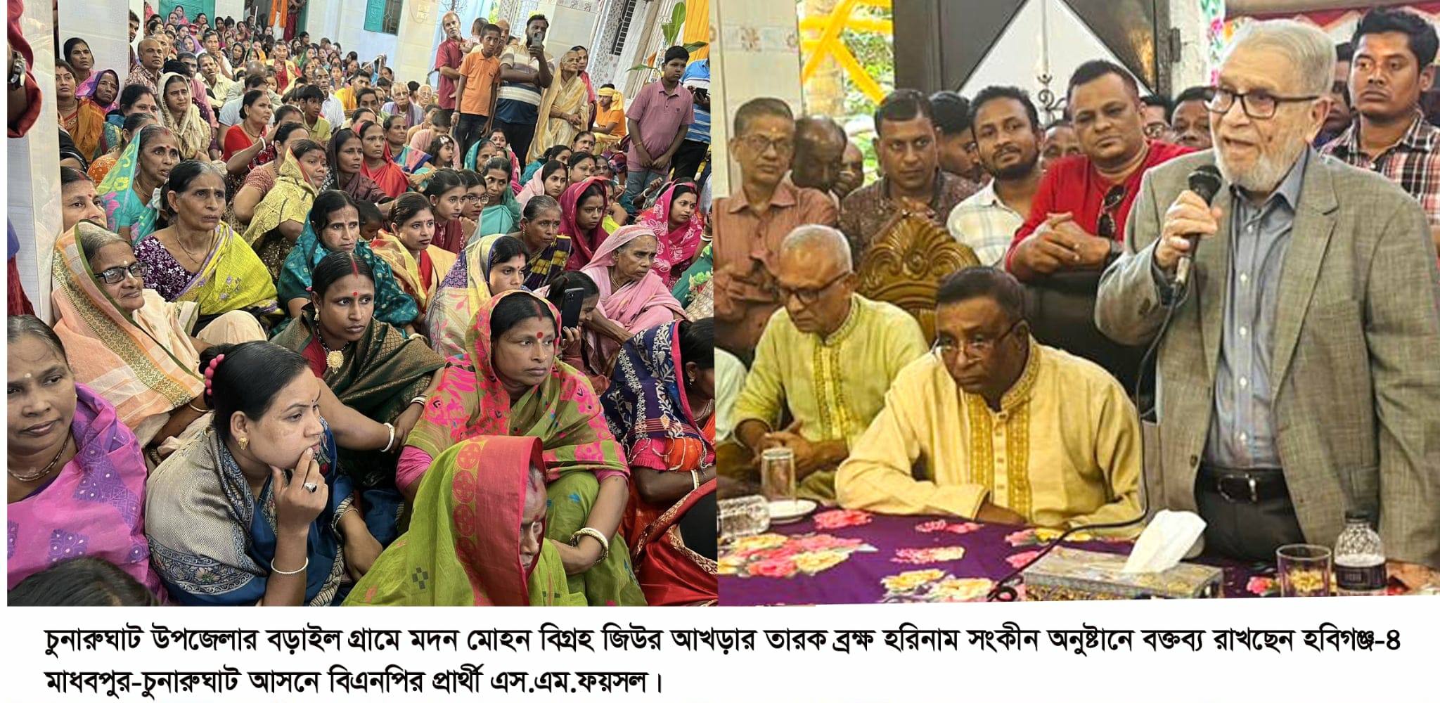 বৃহস্পতিবার বিকালে চুনারুঘাট উপজেলার বড়াইল গ্রামে মদন মোহন জিউর বিগ্রহ আখড়ায় তারকব্রষ্ম হরিনাম সংকীতন অনুষ্টানে ভক্ত বৃন্দের উদ্দেশ্যে প্রধান অতিথির বক্তব্য রাখতে গিয়ে এ কথা বলেন। এ সময় চুনারুঘাট পৌর সভার সাবেক মেয়র নাজিমউদ্দিন শামসু,উপজেলা বিএনপির সাবেক আহবায়ক আবু সালেহ মোঃ শফিকুর রহমান, সৈয়দ সঈদউদ্দিন ডিগ্রী কলেজের উপাধ্যক্ষ মোজাম্মেল হক তালূকদার,যুবদলের আহবায়ক এড. মোজাম্মেল চৌধুরী, সিনিয়র যুগ্ম আহবায়ক আবু নাঈম মোঃ হালিম, উৎসব কমিটির সভাপতি কৃষ্ণপদ ভট্রচার্য্য, সাধারন সম্পাদক কালিপদ আচায্য প্রমুখ।