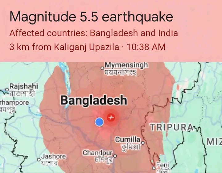 মহিবুর তালুকদার শিবলু : আজ শুক্রবার সকাল ১০টায় ভূমিকম্প হয়েছে। হঠাৎ কম্পনে ঘরবাড়ি দুলে উঠলে মুহূর্তেই আতঙ্ক ছড়িয়ে পড়ে সকলের মাঝে। কয়েক সেকেন্ডের কম্পন হলেও মানুষজন ভীষণ হতাশা ও ভয়ের মধ্যে পড়ে দ্রুত বাসা থেকে বের হয়ে পড়েন।