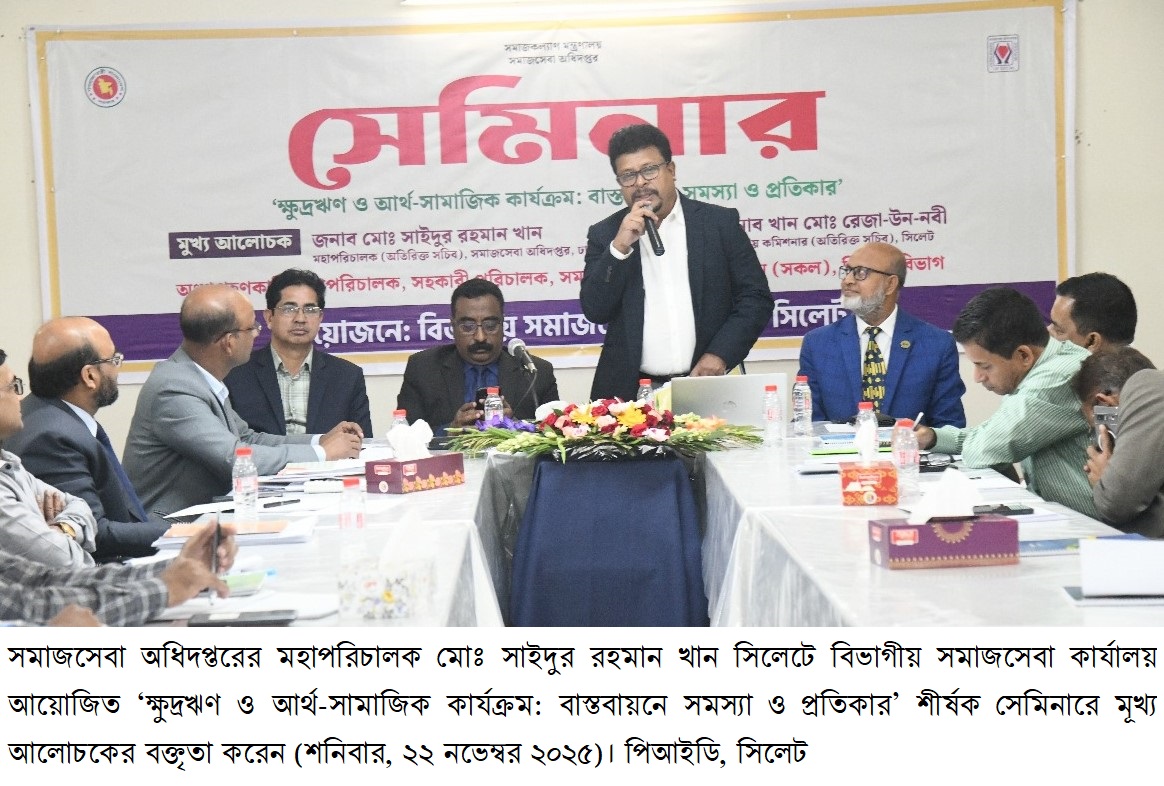 শনিবার (২২ নভেম্বর) সিলেট বিভাগীয় সমাজসেবা কার্যালয় কর্তৃক আয়োজিত ‘ক্ষুদ্রঋণ ও আর্থ-সামাজিক কার্যক্রম: বাস্তবায়নে সমস্যা ও প্রতিকার’ শীর্ষক সেমিনারে মূখ্য আলোচকের বক্তব্যে তিনি এসব কথা বলেন। এতে সভাপতিত্ব করেন সিলেটের বিভাগীয় কমিশনার খান মোঃ রেজা-উন-নবী।