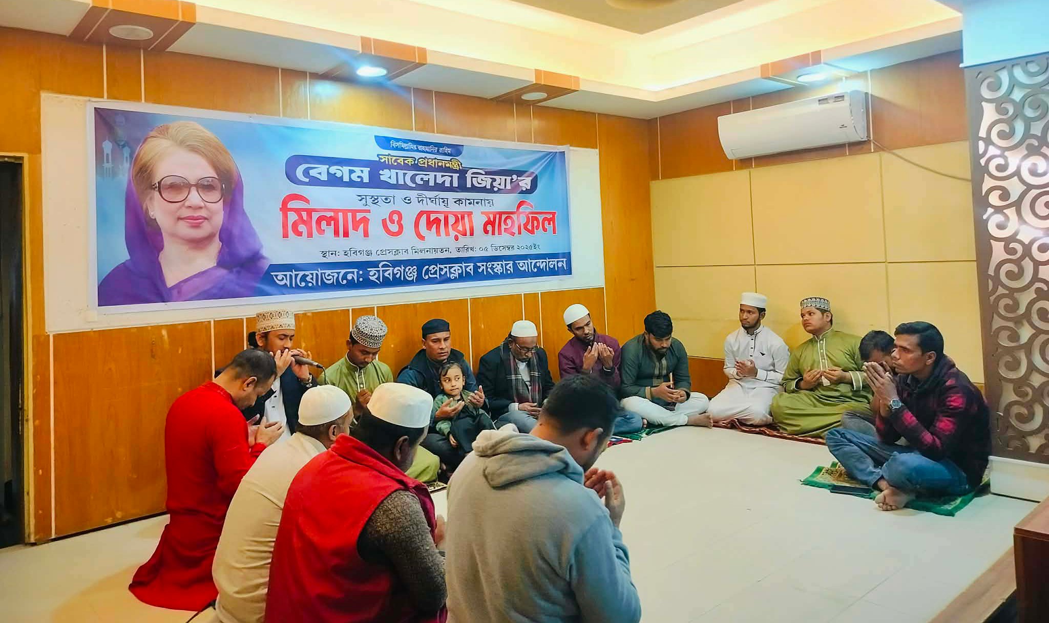 হবিগঞ্জ প্রেসক্লাব সংস্কার আন্দোলনের উদ্যোগে দেশের সাবেক প্রধানমন্ত্রী ও বিএনপি চেয়ারপারসন বেগম খালেদা জিয়ার সুস্থতা ও দীর্ঘায়ু কামনায় মিলাদ ও দোয়া মাহফিল অনুষ্ঠিত হয়েছে।