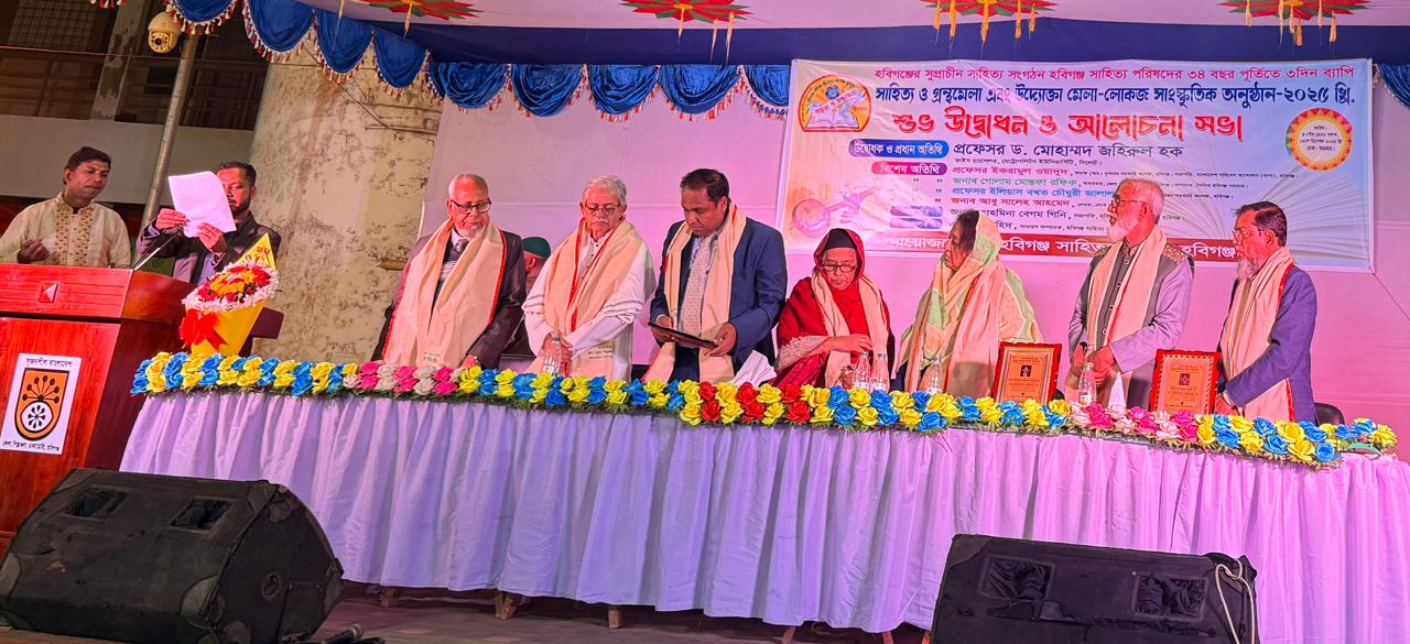 হবিগঞ্জ প্রতিনিধি : হবিগঞ্জের সুপ্রাচীন সাহিত্য সংগঠন হবিগঞ্জ সাহিত্য পরিষদ–এর ৩৪ বছর পূর্তি উপলক্ষে সাহিত্য ও গ্রন্থমেলা, উদ্যোক্তা মেলা এবং লোকজ সাংস্কৃতিক অনুষ্ঠানের শুভ উদ্বোধন ও আলোচনা সভা অনুষ্ঠিত হয়েছে।