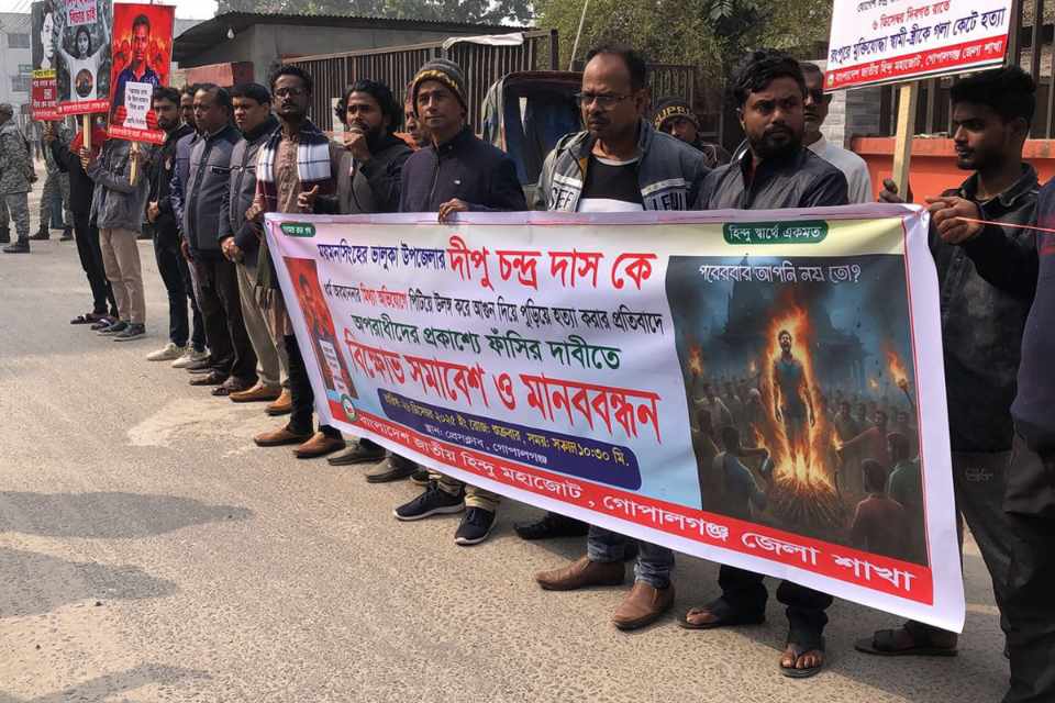 ময়মনসিংহে গার্মেন্টস কর্মী দিপু চন্দ্র দাসকে মধ্যযুগীয় কায়দায় মিথ্যা ধর্ম অবমাননার অভিযোগ এনে হত্যার পর গাছের সঙ্গে ঝুলিয়ে পোড়ানোর ঘটনায় প্রতিবাদ ও দ্রুত বিচারের দাবিতে মানববন্ধন করেছে গোপালগঞ্জ জেলা হিন্দু মহাজোট।