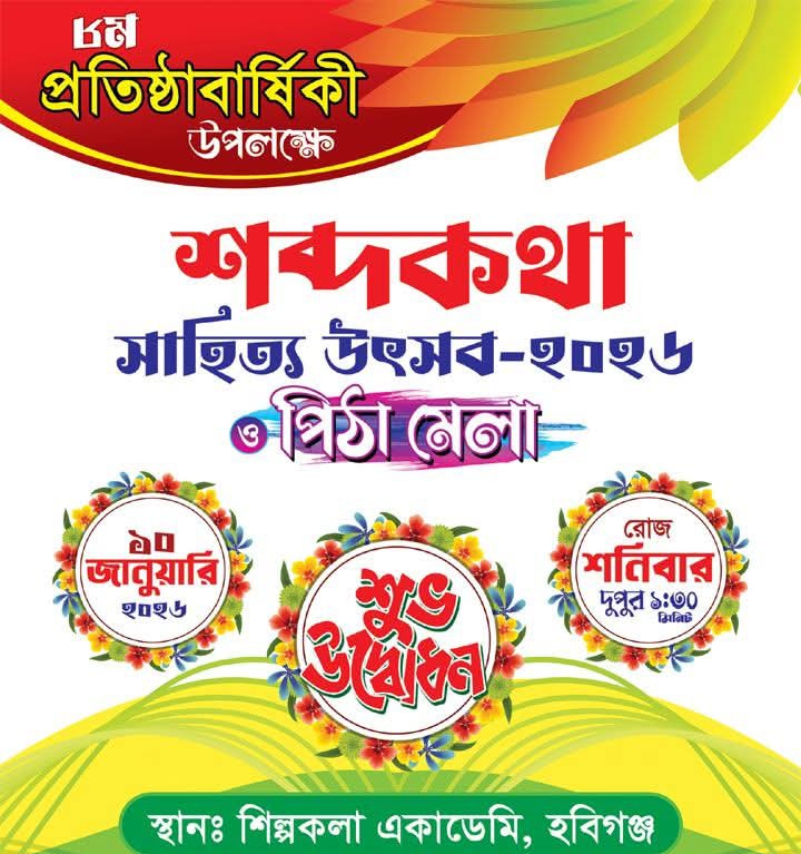 চৌধুরী তাওহীদ বিন আজাদ, হবিগঞ্জ : শব্দকথা প্রকাশনের ৮ম প্রতিষ্ঠাবার্ষিকী উপলক্ষে আগামী ১০ জানুয়ারি ২০২৬ খ্রিস্টাব্দ, শনিবার, হবিগঞ্জ জেলা শিল্পকলা একাডেমিতে তৃতীয়বারের মতো আয়োজন করা হয়েছে “শব্দকথা সাহিত্য উৎসব–২০২৬”। সাহিত্য ও সংস্কৃতির মিলনমেলায় পরিণত হতে যাওয়া এ উৎসবের শুভ উদ্বোধন অনুষ্ঠিত হবে দুপুর ১টা ৩০ মিনিটে।