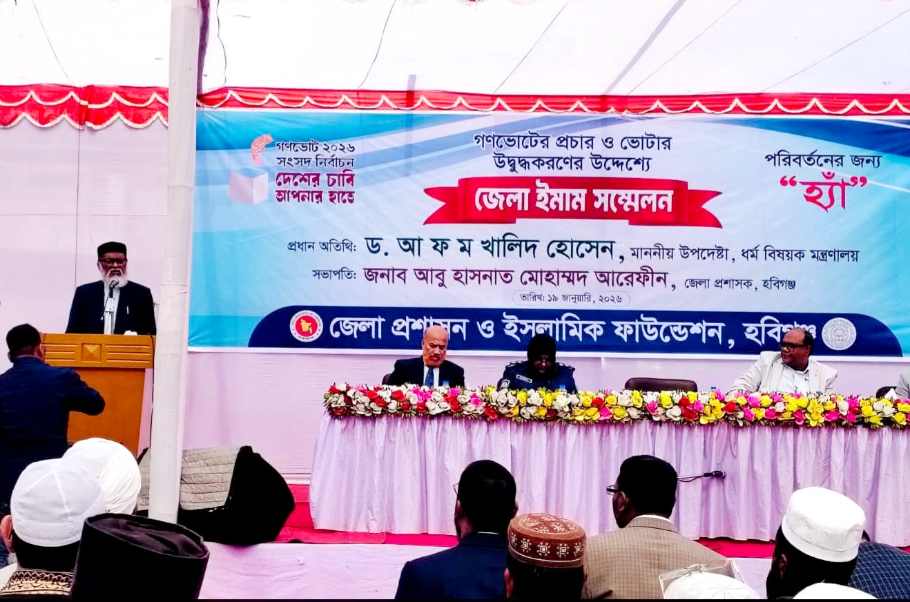 হবিগঞ্জ প্রতিনিধি: গণভোটের প্রচার ও ভোটারদের উদ্বুদ্ধ করার লক্ষ্যে হবিগঞ্জ জেলায় জেলা পর্যায়ে এক ইমাম সম্মেলন অনুষ্ঠিত হয়েছে। জেলা প্রশাসন কার্যালয় প্রাঙ্গণে সোমবার (১৯ জানুয়ারি) জেলা প্রশাসন ও ইসলামী ফাউন্ডেশনের উদ্যোগে আয়োজিত এ সম্মেলনে প্রধান অতিথি হিসেবে উপস্থিত ছিলেন ধর্ম বিষয়ক মন্ত্রণালয়ের উপদেষ্টা ড. আ ফ ম খালিদ হোসেন।