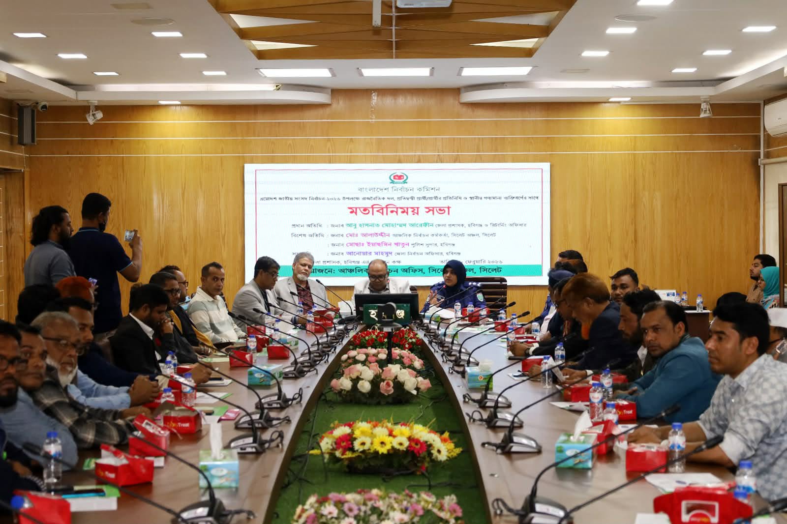 আয়োজিত সভায় প্রধান অতিথি হিসেবে উপস্থিত ছিলেন জনাব আবু হাসনাত মোহাম্মদ আরেফিন জেলা প্রশাসক হবিগঞ্জ ও রিটার্নিং অফিসার এবং বিশেষ অতিথি হিসেবে উপস্থিত ছিলেন পুলিশ সুপার, হবিগঞ্জ।
