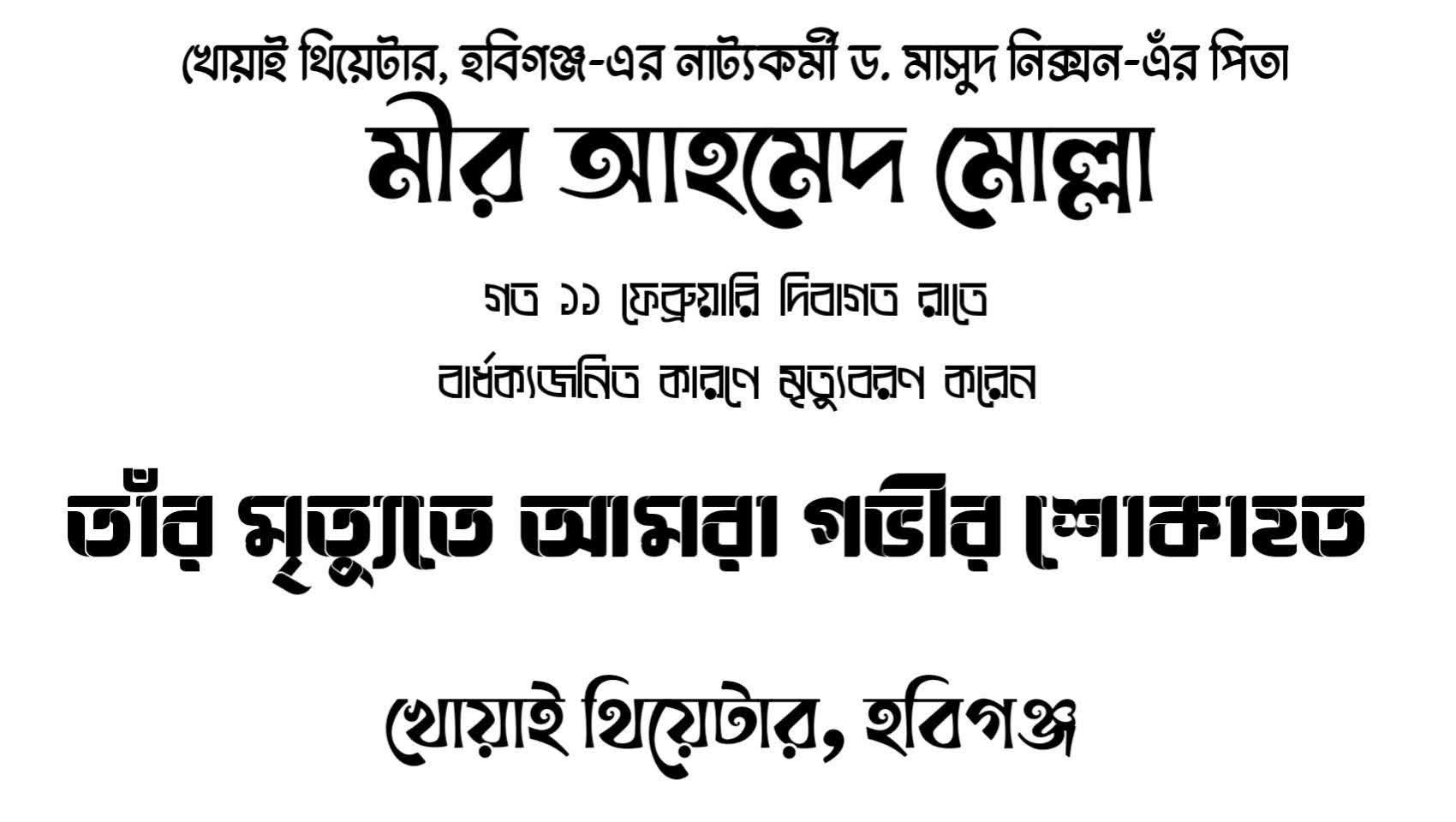 উল্লেখ্য, গত ১১ ফেব্রুয়ারি দিবাগত রাতে বার্ধক্যজনিত কারণে হবিগঞ্জে চিকিৎসাধীন অবস্থায় মীর আহমেদ মোল্লা ইন্তেকাল করেন। তাঁর মৃত্যুতে এলাকায় শোকের ছায়া নেমে এসেছে।