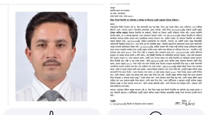 ২৪ ফেব্রুয়ারী হাজির হইলে ডিওফ স্যার আমাকে বলেন, প্রতাব বাবুকে বদলী করা হয়েছে। তুমি যে প্রতাব বাবুকে ১০০০/- টাকা দিয়েছ তাহার একটি লিখিত অভিযোগ দাও। আমি বললাম, প্রতাব বাবু আমার কাছ থেকে কোন টাকা নেন নাই। ডেপুটি রেঞ্জার আশিক মোল্লা নিজ হাতে আবেদন লিখে দিয়েছেন ও আমাকে প্রতাব বাবুর বিষয়ে বলতে বলেন। তখন ডিএফও স্যার ক্ষিপ্ত হয়ে বলে, এখনি আমার অফিস থেকে বেড়িয়ে যান এবং আমাকে হুমকি দিয়ে বলেন, আমি তকে দেখে নিব। তখন দুর্নীতিবাজ ও ঘুষখোর ডেপুটি আশিক মোল্লার বিরুদ্ধে ব্যবস্থা না নিয়ে তিনি আমাকে ধমক দেন।