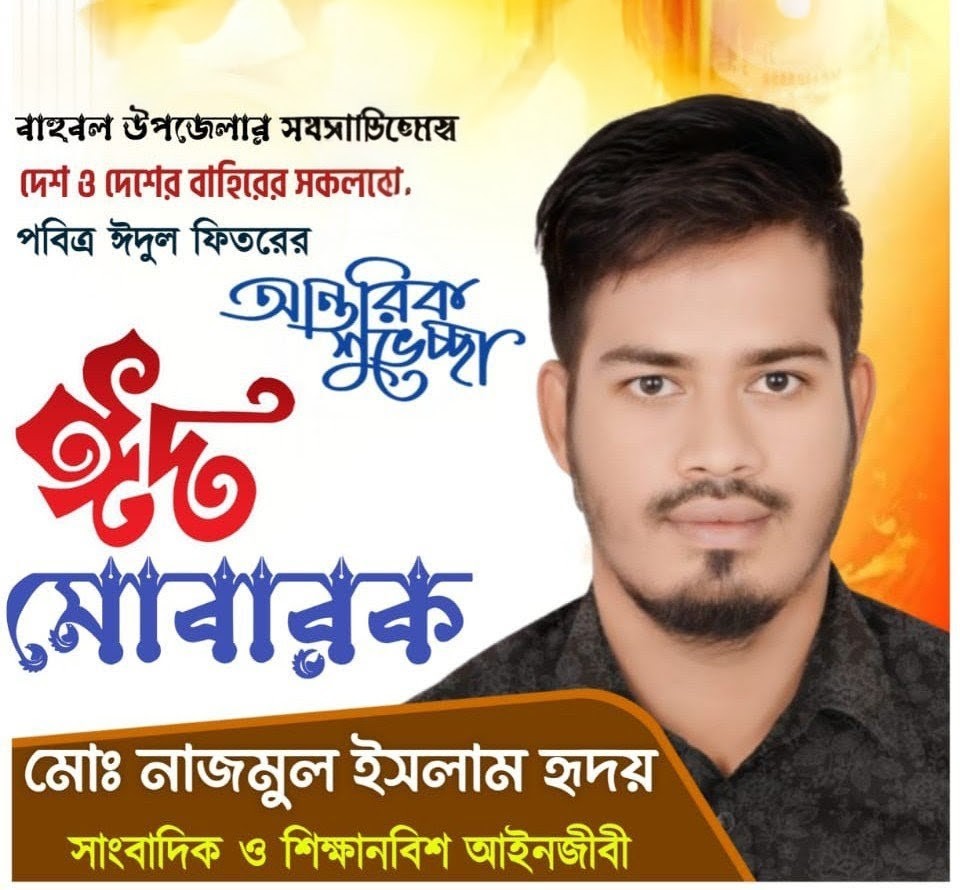 বাহুবল প্রতিনিধি: পবিত্র মাহে রমজানের সিয়াম সাধনা শেষে সমাগত মুসলিম উম্মাহর অন্যতম বৃহৎ ধর্মীয় উৎসব পবিত্র ঈদুল ফিতর উপলক্ষে বাহুবল উপজেলার সর্বস্তরের জনগণসহ দেশ ও দেশের বাইরে অবস্থানরত সকলকে আন্তরিক শুভেচ্ছা ও অভিনন্দন জানিয়েছেন সাংবাদিক ও শিক্ষানবিশ আইনজীবী মোঃ নাজমুল ইসলাম হৃদয় ।