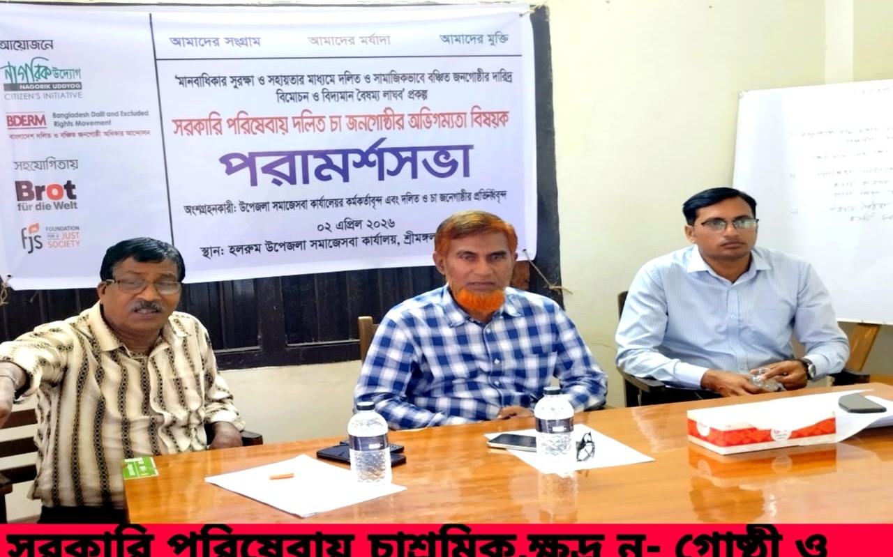 স্মরণ সিংহ : শ্রীমঙ্গল উপজেলার সমাজসেবা কার্যালয়ে মানবাধিকার সুরক্ষা ও সহায়তার মাধ্যমে দলিত ও সামাজিকভাবে বঞ্চিত জনগোষ্ঠীর দারিদ্র বিমোচন ও বিদ্যমান বৈষম্য লাঘবে সরকারি পরিষেবায় দলিত চা জনগোষ্ঠীর অভিগম্যতা বিষয়ক পরামর্শ সভা আয়োজনে "আমাদের সংগ্রাম, আমাদের মর্যাদা, আমাদের মুক্তি" প্রতিপাদ্য বিষয়ে বিশদভাবে সমাজসেবার কার্যক্রম, সুযোগ সুবিধা প্রশ্ম উত্তরে জিজ্ঞাসা ও আলোচনা করেন উপজেলা সমাজসেবা কর্মকর্তা মোঃ সুয়েব হোসেন এর সাথে দলিত ও চা জনগোষ্ঠী প্রতিনিধিত্বকারীরা।