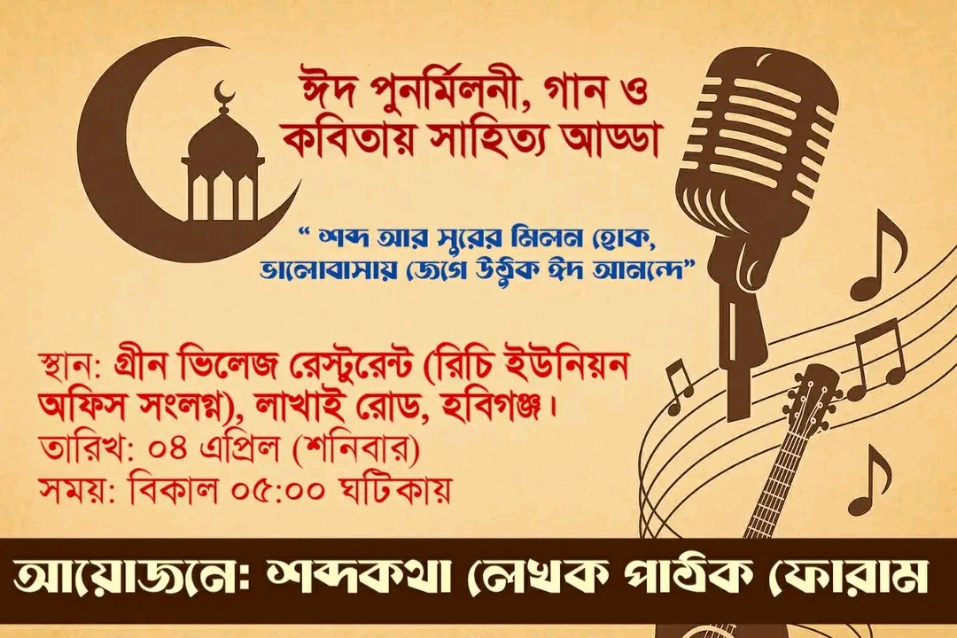 আগামী (শনিবার) ০৪ এপ্রিল বিকাল ০৫:০০ ঘটিকার সময় ঈদ পুনর্মিলনী, গান, কবিতা ও সাহিত্য আড্ডার আয়োজন করা হয়েছে।