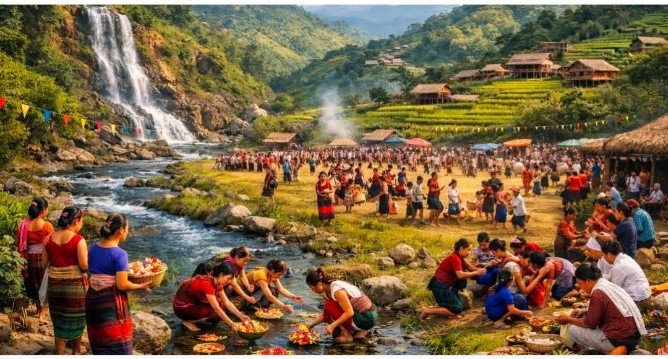 নিপুণ চন্দ্র : ভোরের আলো ফোটার আগেই পাহাড়ি যুবক-যুবতীরা ফুলের ঝুড়ি নিয়ে ছড়িয়ে পড়ে। ঘর সাজানো হয় লতাপাতা-ফুলে। তারপর নদীতে ফুল ভাসানো।