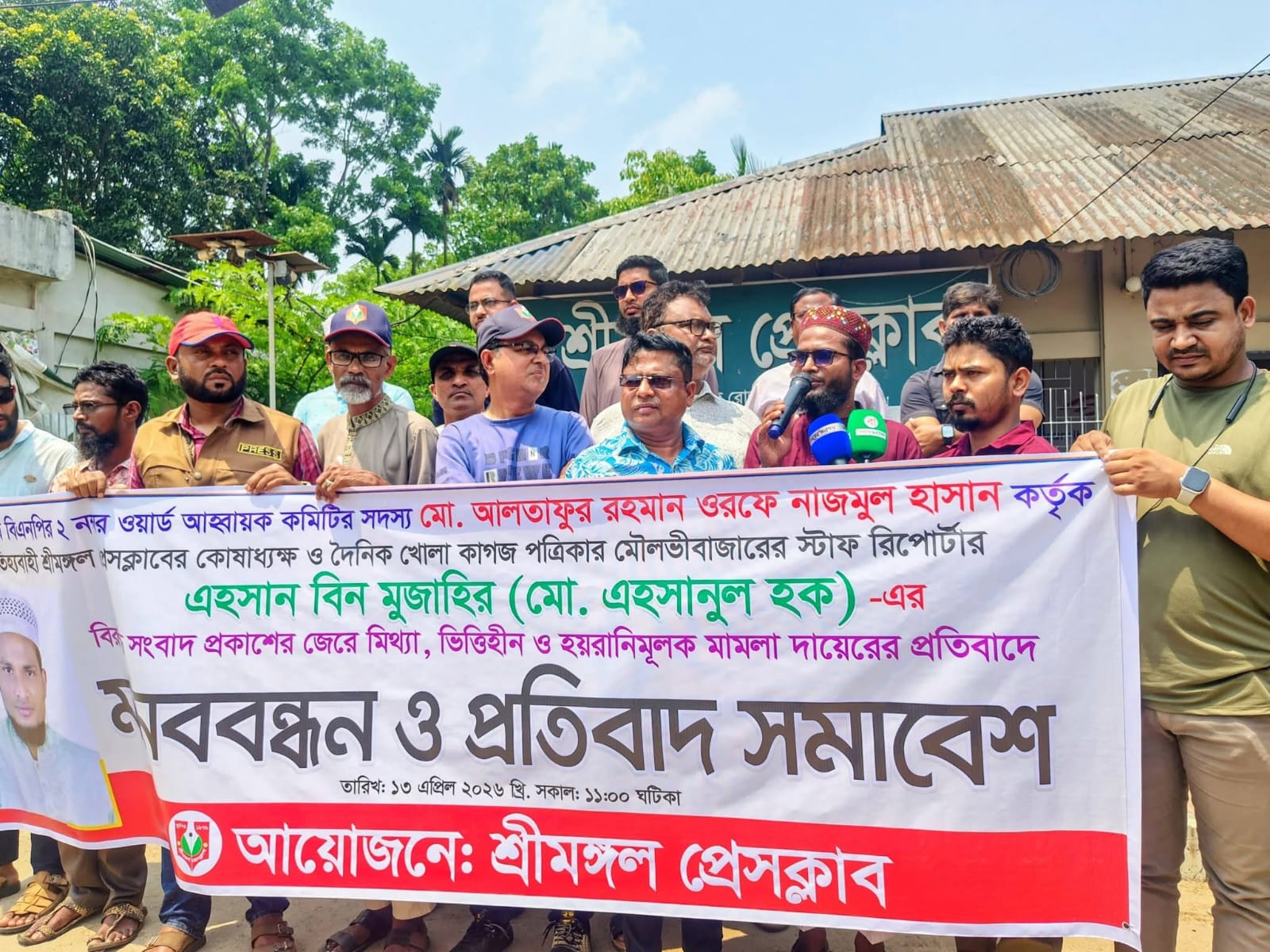 মৌলভীবাজার প্রতিনিধি: শ্রীমঙ্গল প্রেসক্লাবের কোষাধ্যক্ষ ও অনুসন্ধানী সাংবাদিক এহসান বিন মুজাহির এর বিরুদ্ধে হয়রানিমুলক মিথ্যা মামলা দায়েরের প্রতিবাদে শ্রীমঙ্গলে প্রতিবাদ সমাবেশ ও মানববন্ধন কর্মসূচি পালিত হয়েছে।