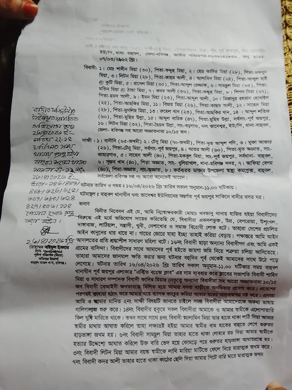 অভিযোগে আরও বলা হয়, হামলাকারীরা খদভানুকে টেনে-হিঁচড়ে ঘরের বাইরে এনে মারধর করে এবং শ্লীলতাহানি করে। তার চিৎকারে অনার্স পড়ুয়া মেয়ে মুক্তা আক্তার ঘটনাস্থলে এগিয়ে এলে তাকেও মারধর ও শ্লীলতাহানির শিকার হতে হয়।