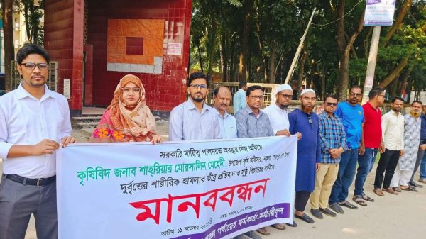 মোঃ হারুন অর রশিদ শেরপুর জেলার নকলা উপজেলা কৃষি কর্মকর্তা কৃষিবিদ শাহরিয়ার মােরসালিন মেহেদীর ওপর অমানবিক শারীরিক হামলার প্রতিবাদে জামালপুরের বকশীগঞ্জে মানববন্ধন অনুষ্ঠিত হয়েছে। মঙ্গলবার (১১ নভেম্বর) সকালে বকশীগঞ্জ